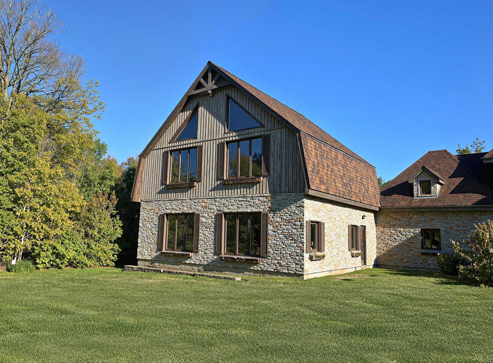 Murs : Hauteur intérieure de 99″, Épinette 2×6 aux 16″, panneaux R4, sablière doublée, coins triplés entrecroisés, Tyvek, fourrure